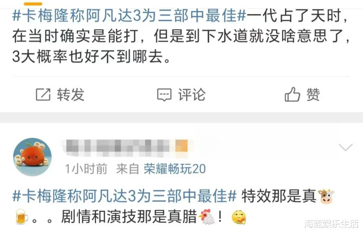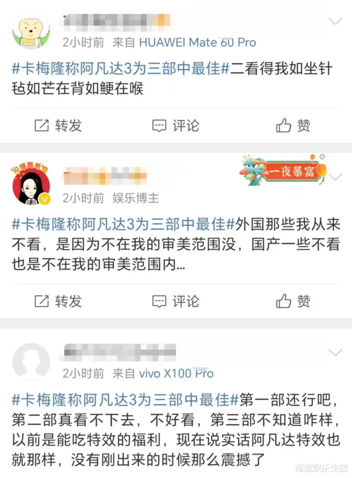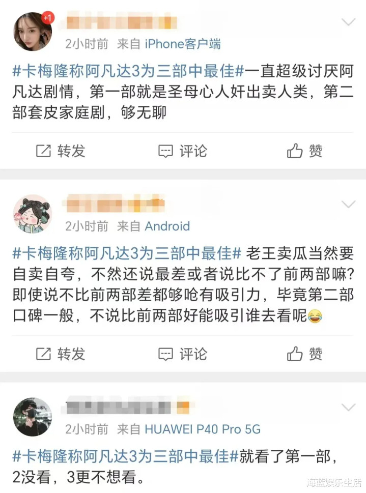 还有一些网友表示,当初看了前两部《阿凡达》后,感觉除了特效外,在剧情上,似乎有一种上当的感觉。